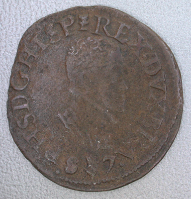 - BeschrijvingVz:Borstbeeld van Philips II naar rechts. Onder het borstbeeld het jaartal 8 handje 7. Daaromheen het omschrift en een parelrand. Kz: Gekroond wapen van Oostenrijk-Bourgondiƫ. Daaromheen het omschrift en een parelrand.