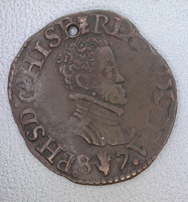- BeschrijvingVz:Borstbeeld van Philips II naar rechts. Onder het borstbeeld het jaartal 8 handje 7. Daaromheen het omschrift en een parelrand. Kz: Gekroond wapen van Oostenrijk-Bourgondiƫ. Daaromheen het omschrift en een parelrand.