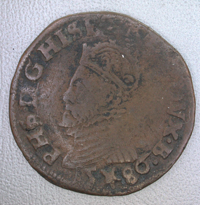 - BeschrijvingVz:Het gekroonde borstbeeld van Philips II naar links. Daaromheen het omschrift en een parelrand. Kz: Het gekroonde Oostenrijks-Bourgondische wapen. Daaromheen het omschrift en een parelrand.