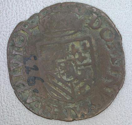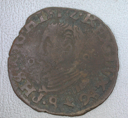 - BeschrijvingVz: Het naar links gewende ongekroonde borstbeeld van Philips II. Links van het hoofd één ringetje, rechts van het hoofd twee ringetjes. Om het geheel het omschrift en een parelrand. Kz: Het gekroonde Oostenrijks-Bourgondische wapen. Om het geheel het omschrift en een parelrand.
