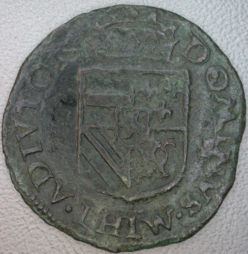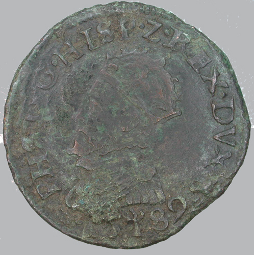 - BeschrijvingVz:gekroonde buste naar links, daaronder het jaartal 15 boompje 89; omschrift: .PHS.D.G.HISP.Z.REX.DVX.BRA. Kz:gekroond Oostenrijks-Bourgondische wapen; omschrift: DOMINVS.MIHI.A¬DIVTOR