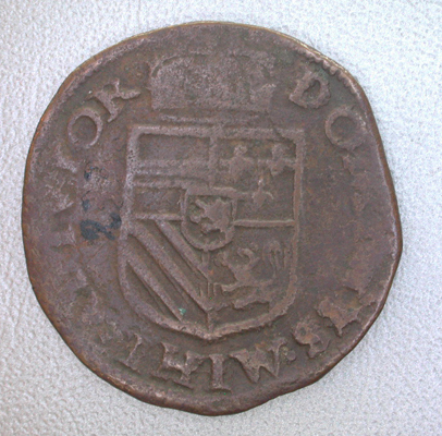 - BeschrijvingVz: Het naar links gewende gekroonde borstbeeld van Philips II. Daaromheen het omschrift en een parelrand. Kz: Het gekroonde Oostenrijks-Bourgondische wapen. Daaromheen het omschrift en een parelrand.