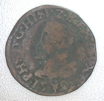 - BeschrijvingVz: Het naar links gewende borstbeeld van Philips II. Tussen een getrokken rand en een parelrand het omschrift. Kz: Het gekroonde Oostenrijks-Bourgondische wapen. Tussen een getrokken rand en een parelrand het omschrift.