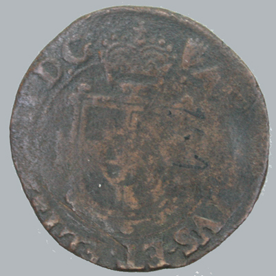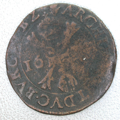 Vz: Gekroonde cartouche met het Oostenrijks-Bourgondische wapen, beladen met het Brabantse wapen. Tussen een getrokken rand en een parelrand het omschrift. Kz: Een stammenkruis beladen met een gekroond vuurstaal waaraan het ordeteken van het Gulden Vlies hangt. In het bovenste kwartier een kroon links en rechts het jaartal 16- (onleesbaar). Tussen een getrokken rand en een parelrand het omschrift.