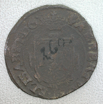 Vz: Het gekroonde wapen van Oostenrijk-Bourgondiƫ beladen met het Brabantse wapen. Tussen een getrokken rand en een parelrand het omschrift. Kz: Een stammenkruis beladen met een vuurstaal waaraan het ordeteken van het Gulden Vlies hangt. In het bovenste kwartier een kroon, links en rechts het jaartal 16-15. Tussen een getrokken rand en een parelrand het omschrift