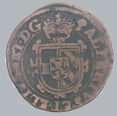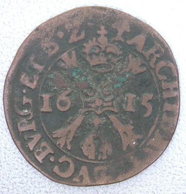 Vz: Gekroonde cartouche met het wapen van Oostenrijk-Bourgondiƫ, beladen met het wapen van Brabant. Tussen een getrokken rand en een parelrand het omschrift. Kz: Een stammenkruis beladen met een vuurstaal waaraan het ordeteken van het Gulden Vlies hangt. In het bovenste kwartier een kroon ter weerszijden van het vuurstaal het jaartal 16-15. Tussen een getrokken rand en een parelrand het omschrift.
