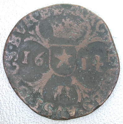 Vz: Het gekroonde aartshertogelijke wapen,geflankeerd door twee vijfpuntige sterren (muntteken van Maastricht). Tussen een getrokken rand en een parelrand het omschrift. Kz: Een stammenkruis beladen met het gekroonde wapen van Maastricht, waaraan het ordeteken van het Gulden Vlies hangt. Ter weerszijden van het wapen het jaartal 16-14. Tussen een getrokken rand en een parelrand het omschrift.