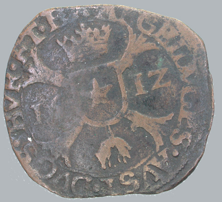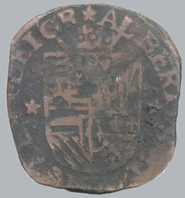 Vz: Het gekroonde aartshertogelijke wapen,geflankeerd door twee vijfpuntige sterren (muntteken van Maastricht). Tussen een getrokken rand en een parelrand het omschrift. Kz: Een stammenkruis beladen met het gekroonde wapen van Maastricht, waaraan het ordeteken van het Gulden Vlies hangt. Ter weerszijden van het wapen het jaartal 16-14. Tussen een getrokken rand en een parelrand het omschrift.