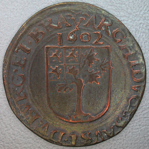 - BeschrijvingVz: Het gekroonde aartshertogelijke wapen. Daaromheen het omschrift en een parelrand. Kz: Het stadswapen van 's-Hertogenbosch, met daarboven het jaartal 1602. Daaromheen het omschrift en een parelrand.