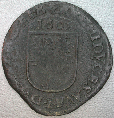 - BeschrijvingVz: Het gekroonde aartshertogelijke wapen. Tussen een getrokken rand en een parelrand het omschrift. Kz: Het stadswapen van 's-Hertogenbosch, met daarboven het jaartal 1603. Tussen een getrokken rand en een parelrand het omschrift.