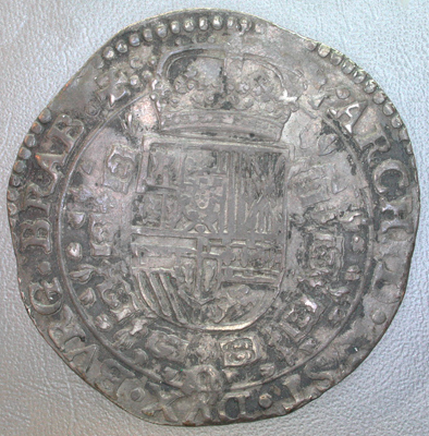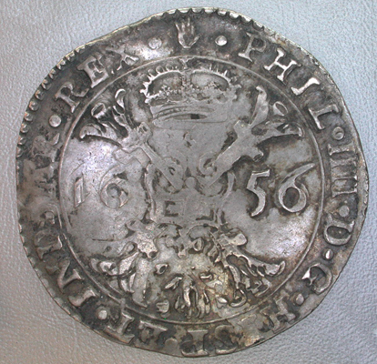 Vz: Een stammenkruis beladen met een gekroond vuurstaal waaraan het ordeteken van het Gulden Vlies hangt. Ter weerszijden van het vuurstaal het jaartal 16-56. Tussen een getrokken rand en een parelrand het omschrift. Kz: Het gekroonde koninklijke wapen, omhangen met een Gulden Vliesteken. Uit de vuurstalen in de keten springen vonken. Tussen een getrokken rand en een parelrand het omschrift/