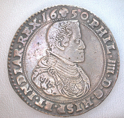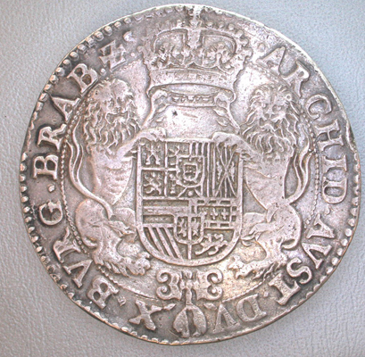 - BeschrijvingVz: Het ongekroonde borstbeeld van Philips IV naar rechts met snor en kleine kraag. Tussen twee parelranden het omschrift.Kz: Het koninklijke wapen geflankeerd door twee leeuwen die er een kroon boven houden. Onder het wapen hangt het ordeteken van het Gulden Vlies. Tussen twee parelranden het omschrift.