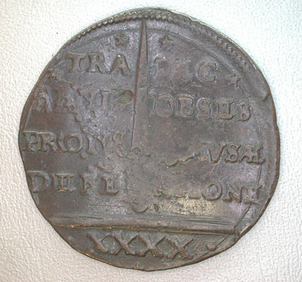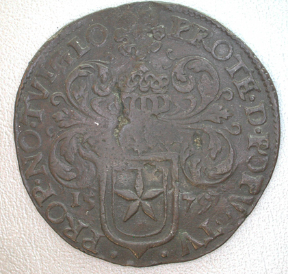 - BeschrijvingVz: Een hand met opgeheven zwaard, geflankeerd door het opschrift. In de afsnede de waarde-aanduiding XXXX. Om het geheel een parelrand. Kz: Gehelmd stadswapen daaromheen het omschrift en een parelrand.
