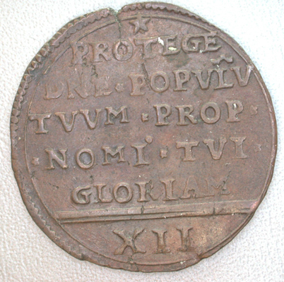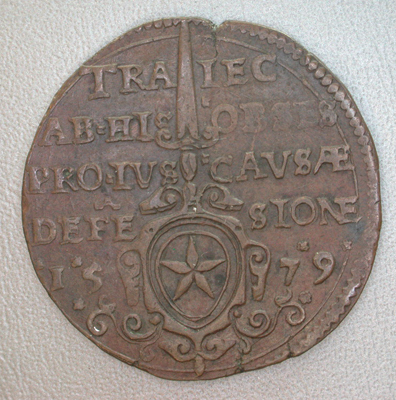 - BeschrijvingVz: Stadswapen in rolwerkomlijsten, daarboven een zwaard. Links en rechts het opschrift. Om het geheel een getrokken rand en een parelrand. Kz: Vijfpuntige ster daaronder het opschrift. In de afsnede de waarde-aanduiding XII. Om het geheel een getrokken rand en een parelrand.