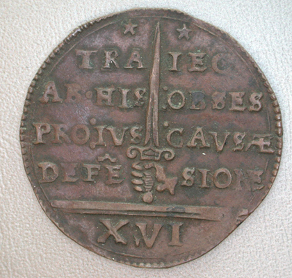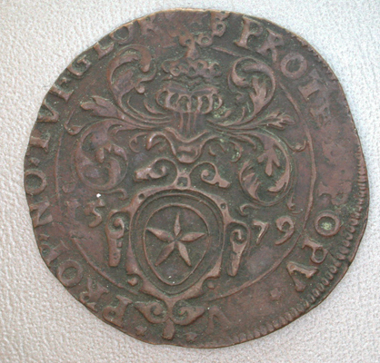 - BeschrijvingVz: Hand met geheven zwaard geflankeerd door het opschrift. In de afsnede de waardeaanduiding XVI. Om het geheel een getrokken rand en een parelrand. Kz: Het gehelmde stadswapen in een rolwerkomlijsting, geflankeerd door het jaartal 15-79. Tussen een getrokken rand en een parelrand het omschrift.