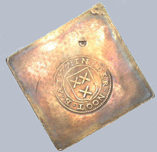 - BeschrijvingVz: Het stadswapen van Breda. Tussen een getrokken rand en een parelrand het omschrift. Daarbuiten de klop met een hoorntje. Kz: Gegraveerd opschrift.