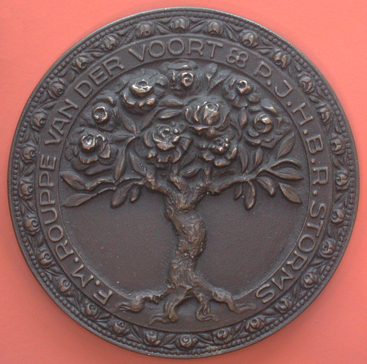 voorzijde De geslachtsboom met vijf grote rozen 9vijf kinderen0 en vier kleine rozen 9vier aangetrouwde kinderen). Daaromheen een vlakke rand met het opschrift: F.M. ROUPPE VAN DER VOORT, vierbladige bloem, P.J.H.B.R. STORMS Daaromheen een rand van 28 kleine roosjes (28 kleinkinderen) en een parelrand. Keerzijde: Het alliantiewapen, helmtekens en dekkleden. Onder de wapens een geplooid lint met het opschrift: 1896/5 FEBR./1946. Om het geheel een parelrand.