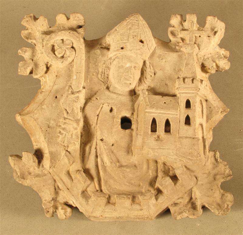 Met afbeelding van Augustinus (?). Veelhoekige steen, waarvan 4 hoeken met gestileerde bladeren, met de halffiguur van een bisschop achter een kanteelrand. In de rechterhand draagt hij een staf, in de linker een kerkmodel. Indien met de bisschop Augustinus is bedoeld, kan het kerkmodel de stad Gods voorstellen. Rond gat in het midden van de steen.