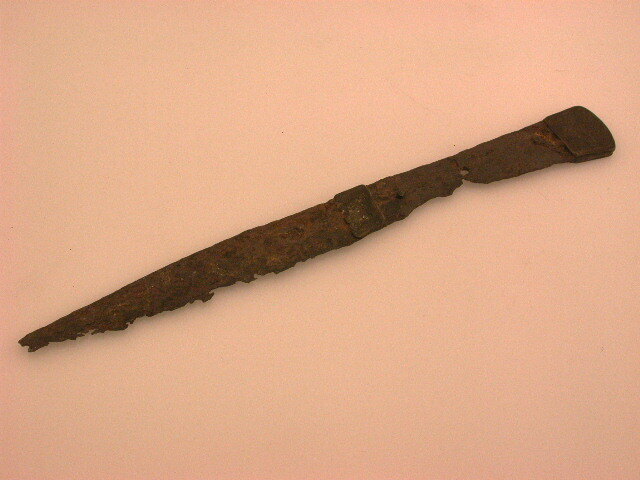 - BeschrijvingIJzeren mes uit een stuk, zwaar doorroest, met heft met verdwenen houten dekplaten tussen resterende koperen manchetplaatjes met bladgravering en dito heft beëindigingsplaatjes met gegraveerd banderol motief.