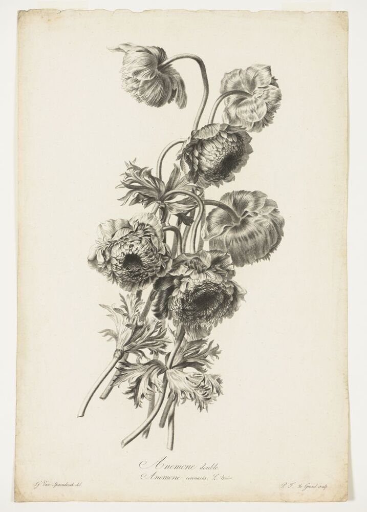 - BeschrijvingOnderschrift: "Anemone double./ Anemone coronaria. L." M.O.: "Droûet". Stippelgravure uit de serie "Fleurs dessinées..." enz.