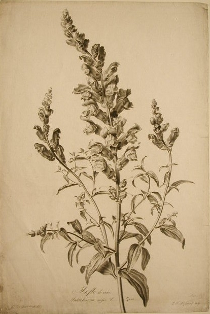 - BeschrijvingOnderschrift: "Mufle de veau./ Antirrhium majus. L." M.O.: "Droûet". Uit de serie "Fleurs dessinées.." enz.