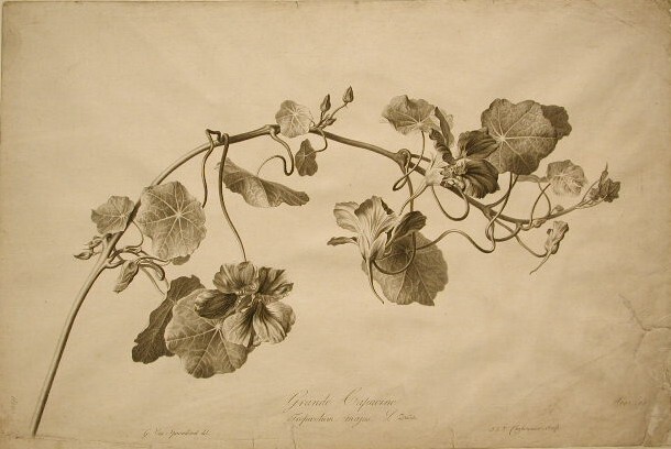 - BeschrijvingOnderschrift: "Grande Capucine./Tropaeolum majus. L." M.O.: "Droûet". Uit de serie "Fleurs dessinées.." enz.