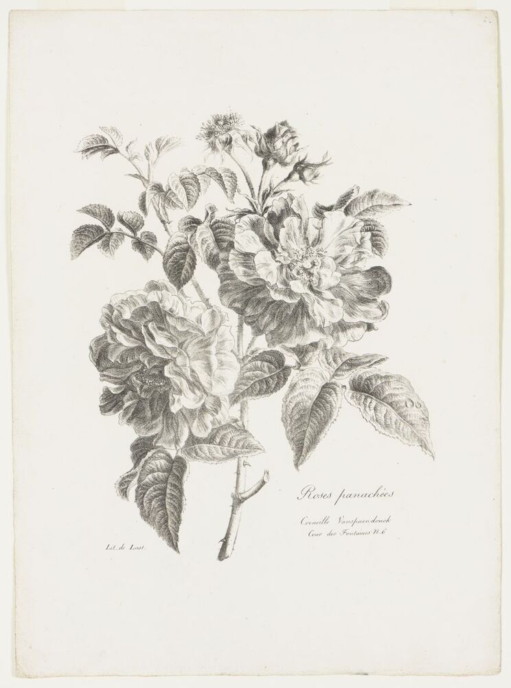 - BeschrijvingOnderschrift: "Roses panachées". Litho uit de serie "Fleurs dessinées.." enz.