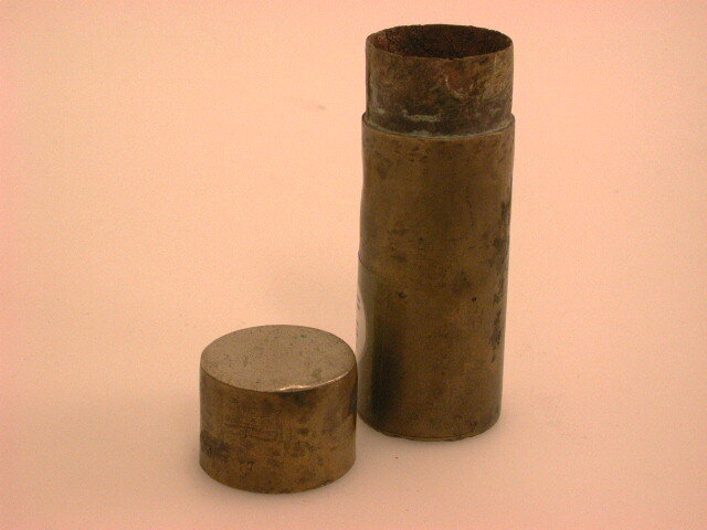 Geelkoperen cilindrische koker met dito opschuifbare deksel en ijzeren binnenhuls.