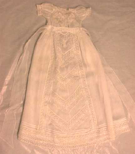 Doopjurk van witte katoenen batist. Versierd met machinale valencienne kantjes en geborduurde randen. Borduurwerk uitgevoerd door de handborduurmachine. Het lijfje is versierd met een kanten "befje". In de rok een naar beneden toe breder wordende baan versierd met in V-vorm ingezette stroken kant en geborduurde batist. Onderrok van witte katoenen batist met doorgeschoven lintje in de taille en 2 opnaadjes boven de brede zoom.