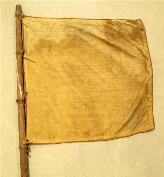 Met stok inv.nr. 11457.3. Naturel linnen vlag omzoomd door dik naturel touw. In roek 4 metalen ringen, waardoor touw waarmee vlag aan stok bevestigd is.