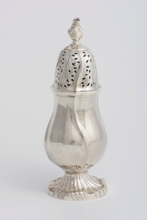 - BeschrijvingZilveren suikerstrooier, glad getordeerd model, wat onregelmatig gevormde voet, met brede concave groeven. Bekroond door gedraaid knopje. Gaatjes in deksel in de vorm van blaadjes, verbonden door gegraveerde takjes. Aan binnenzijde voet, gegraveerde initialen: "B.S."