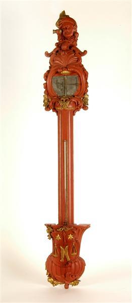 - BeschrijvingDecoratie met voluten en rankwerk in Lodewijk XV-stijl. Bekroning wordt gevormd door narrehoofd met bepluimde hoed en verrekijker. Onderstuk toont ornamentale versiering met voorstelling van een weegschaal, geflankeerd door twee sterren en twee vissen. Zomer- en winterschaal.
