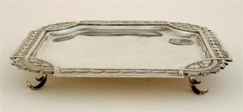 - BeschrijvingVierkant blaadje, ook cabaret genoemd, voorzien van een gedreven rand van aaneengeschakelde bloemkelken (culots), met in de hoeken een bloemrozet. De vier pootjes hebben de vorm van een gekruld blad. De decoratie heeft een Zuidnederlands karakter.