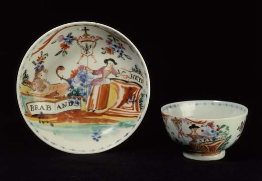 Chinees wit porseleinen kommetje met bijbehorende onderschotel, met bloemdecoratie in blauw onderglazuur (zgn. Amsterdams Bont). Het porselein is in de Noordelijke of in de Zuidelijke Nederlanden overgeschilderd (bovenglazuur) met een veelkleurige voorstelling die betrekking heeft op de politieke gebeurtenissen in de jaren 1787-1790. De op de kop en schotels afgebeelde vrijheidsmaagd, zinnebeeld van vrijheid en van de onafhankelijke staat, alsmede de opschriften 'BRABANDS VRYHEID' en 'BRABANDS V HEYD' verwijzen naar de zgn. Brabantse omwenteling de leeuw, hier gaand, maar omziend weergegeven, is het symbool van kracht en tevens het Brabantse wapendier. Het aan de bovenzijde van de voorstelling afgebeelde gekroonde wapen, is dat van de vrijheid Arendonk nabij Turnhout, eveneens gelegen in de Kempen, waar de eerste successen van de Brabantse patriotten werden behaald. Het kruis boven de kroon duidt vermoedelijk op een verband met de conservatief-clericale partij der Statisten.