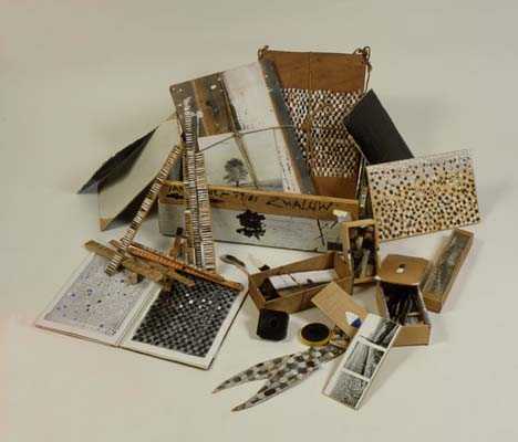 - BeschrijvingKist met inhoud, waaronder foto- en filmmateriaal, beschilderde plankjes, cahiers, werkboek etc.