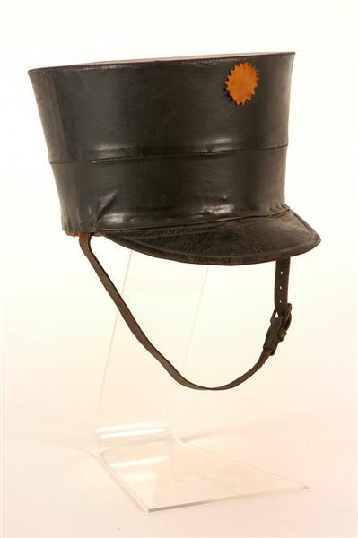 Model 1831, voor een mobiele plattelandsschutter. Opstaande kant van bruin karton, bodem en opstaande kant overtrokken met zwart wasdoek. Leren klep aan de bovenzijde zwart, aan de onderzijde groen gelakt, met ingeperste rand. Zweetband van zwart leer, waaraan een brede strook zwarte katoen bevestigd is. Door de zoom van de katoenen strook is zwart garen geregen. Ter versteviging van de sjako is aan de binnenzijde tegen de onderrand van het bruine karton een reep van hetzelfde karton genaaid. Keelbanden van zwart leer met metalen gesp. Kokarde van oranje vilt. Machinaal genaaid. Waarschijnlijk is slechts de klep origineel en is het overige gedeelte van de sjako een kopie van het oorspronkelijke model