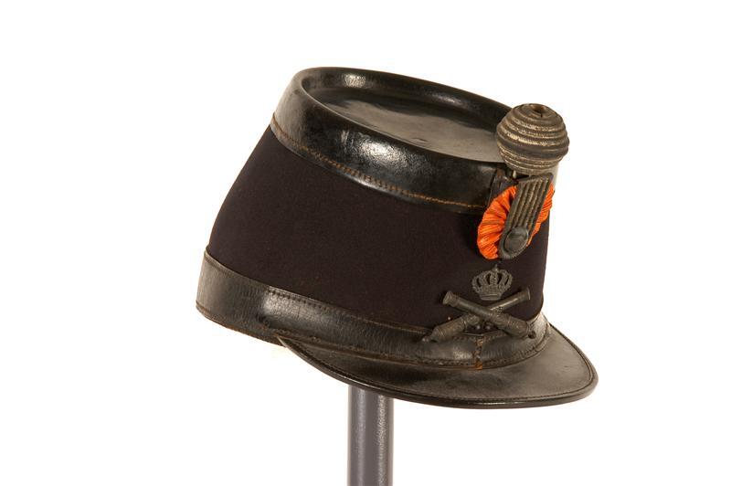 Model 4 april 1868, voor 1e luitenant der artillerie. Sjako van zwart laken. Verdiepte bodem van zwart leer met omgeslagen rand en in het midden een ingeperst bolletje. Langs de onderrand een schuingesneden zwarte leren band. Leren klep, bovenzijde zwart, onderzijde groen. Klep rondom afgezet met een zwart leren bandje. Zweetband van bruin geprent leer. Voering bodem en opstaande kant van blauw papier, beplakt met blauwe zijde. Binnen in de sjako, aan beide zijden, een metalen haak. Hieraan is een zwarte leren stormband met metalen gesp bevestigd. Oranje zijden kokarde. Metalen lis met gladde gebombeerde metalen knoop. Metalen ronde bal met gat. Met pluim, inv.nr. 11747.238.