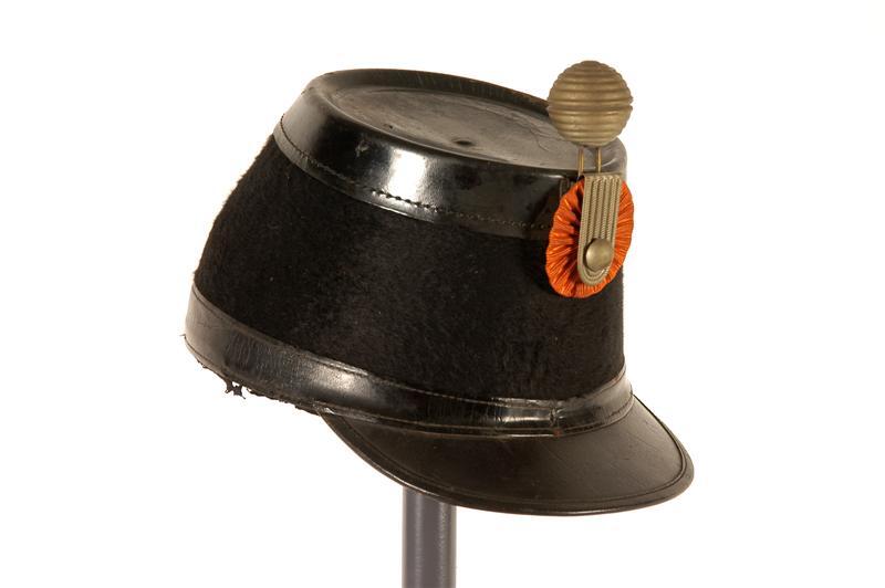 Model 5 aug. 1868, voor onderofficier. Sjako van fijn zwart vilt. Verdiepte bodem van zwart leer met omgeslagen rand en ingeperst bolletje. Langs de onderrand een schuingesneden zwarte leren band. Leren klep, rondom afgezet met een zwart leren bandje. Bovenzijde klep zwart, onderzijde groen. Zweetband van bruin leer. Stormband van zwart leer met zwarte metalen gesp, aan de sjako bevestigd aan zwarte metalen haken. Oranje zijden kokarde. Metalen lis met gladde gebombeerde metalen knoop. Ronde metalen bal. 2 sleufjes in het vilt voor de bevestiging van de sjakoplaat (niet aanwezig).