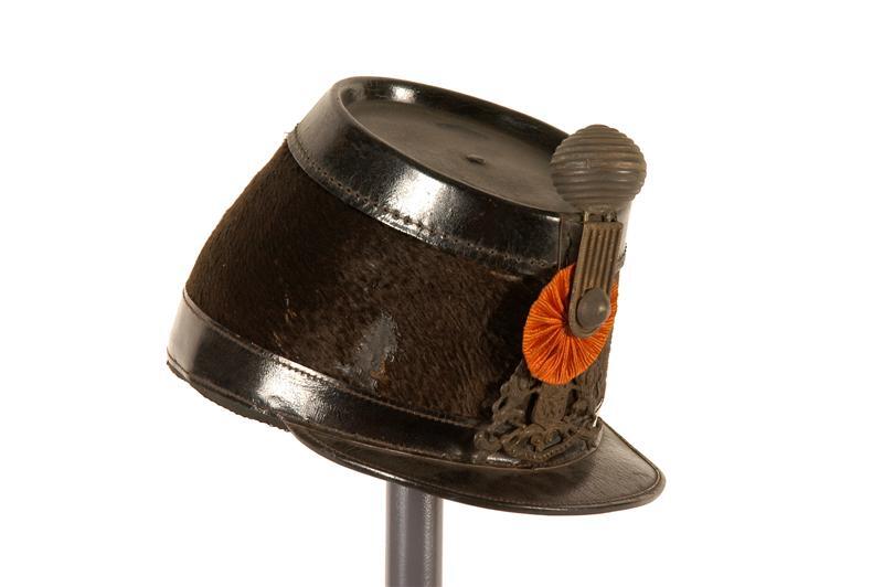 Model 5 aug. 1868, voor onderofficier. Sjako van zwart kastoor. Tussenvoering van gesteven katoen. Verdiepte bodem van zwart leer met omgeslagen rand en in het midden een ingeperst bolletje. Langs de onderrand een schuin gesneden zwarte leren band. Leren klep, bovenzijde zwart, onderzijde groen. De klep is rondom afgebiest met een zwart leren bandje. Zweetband van bruin geprent leer. Voering van bruin papier. Het papier van de bodem heeft een ingeperst patroon. Binnen in de sjako, aan beide zijden, een zwarte metalen haak. Kokarde van oranje zijde. Metalen lis met gladde gebombeerde metalen knoop. Metalen sjakoplaat met het koninklijk wapen. Ronde metalen bal. "Met pluim" is mogelijk een foutieve vermelding van A.J.J. van de Well in de onder de literatuur vermelde catalogus. Zie pluim, inv.nr. 11747.236.