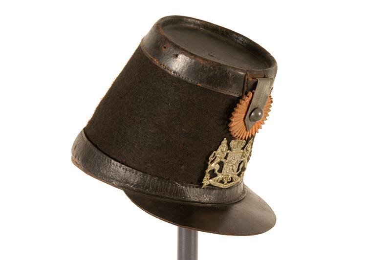 Model 23 juni 1854, voor schutter. Sjako van zwart vilt. Verdiepte bodem van zwart leer met omgeslagen rand en ingeperst bolletje. Langs de onderrand een schuingesneden zwarte leren band. Boven deze band aan de linkerzijde een zwart trensje. Leren klep, bovenzijde zwart, onderzijde bruin. Zweetband van zwart geprent leer. Stormband van zwart leer met koperkleurige gesp, vastgenaaid aan de binnenzijde van de sjako. De stormband is aan beide zijden van de sjako door een sleuf in de zweetband gehaald. Op de binnenkant van de bodem is een reep zwart leer bevestigd. Oranje leren kokarde. Metalen lis met gladde gebombeerde metalen knoop. Metalen sjakoplaat met het koninklijke wapen. Achter de lis een vlam van zwart afhangend paardehaar met pompon van zwarte wol gestoken (inv.nr. 11747.249). Opmerking van dhr. F.J.H.Th. Smits dd 7-9-1983: Bij deze sjako hoort een ronde metalen bal met gat of een bal van stof: rood voor flankeurs, wit voor tirailleurs. De zwarte bal is niet juist.