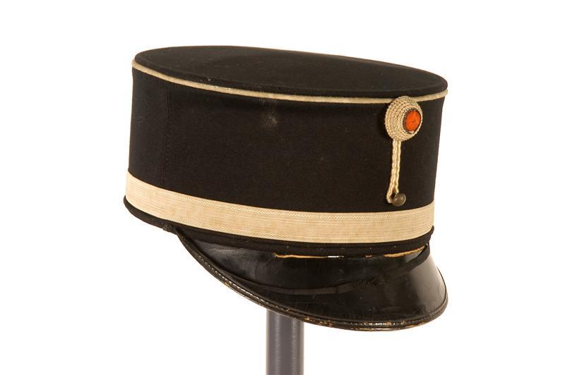 Model 24 aug. 1865. voor korporaals en manschappen. Pet (ook genoemd kwartiermuts of veldmuts) van donkerblauw laken. Bodem gebiesd met wit laken. Horizontale ribbel in het laken op ca 1/2 cm afstand van de onderrand. Daarboven een witte zijden band. Leren klep, bovenzijde zwart, onderzijde zwart, geprent. De klep is rondom afgezet met een zwart leren bandje. Langs de bovenkant van de klep een zwart veterbandje. Zweetband van bruin leer. Voering van de opstaande rand rode gestreepte katoenen satijn. Bodem gevoerd met rood leer met ingeperste concentrische cirkels. Kleine ronde kokarde van wit zijden koord, in het midden oranje zijde omgeven door zilverdraad. Lis van witte zijde, klein rond gebombeerd koperen knoopje.