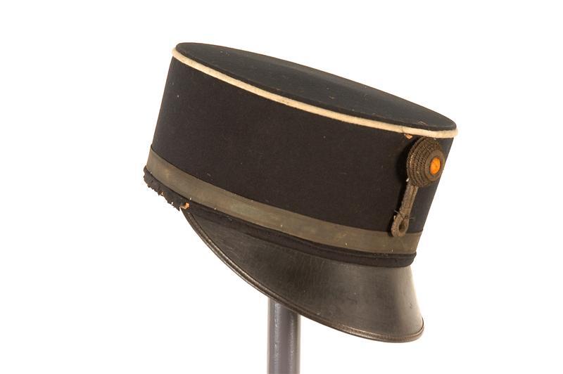 Model 24 aug. 1865. voor officier infanterie. Pet (ook genoemd kwartiermuts of veldmuts) van donkerblauw laken. Bodem gebiesd met wit laken. Horizontale ribbel in het laken op ca 1/2 cm afstand van de onderrand. Zwarte leren klep, gebiesd met een zwart leren bandje. Onderzijde klep van zwart geprent leer. Zweetband van bruin leer. Voering van paars/rose katoen met ingeperst "golfjesmotief". Ronde kokarde van goudkoord en oranje zijde. Kleine lis van zilverkoord met bolvormig, blank metalen knoopje. Boven de ribbel langs de onderrand een zilvergalon.