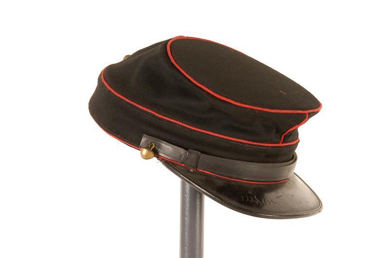 Model t/m 1897, voor manschappen in Oost-Indiƫ. Pet van zwart laken, gebiesd met rood laken. De rode randen bevinden zich op de bodem, langs de boven- en onderrand van de opstaande kant, middenvoor en -achter vertikaal boven de opstaande kant. Leren klep, bovenzijde zwart, onderzijde groen. De klep is rondom afgezet met een zwart leren bandje. Zweetband van bruin leer. Voering van zwarte katoenen satijn. Stormband bestaande uit 2 zwarte leren riemen met lus, boven de klep geplaatst. De riemen zijn aan beide zijden van de pet bevestigd met 2 gladde, gebombeerde koperen knopen.