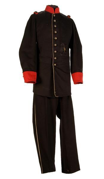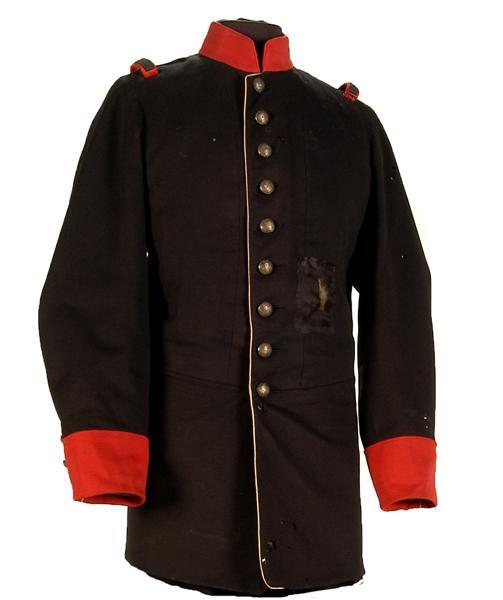 Model 19 jan. 1859, voor majoor. Uniformjas van donkerblauw laken. Kraag en mouwopslagen van rood laken. Sluiting met 9 metalen knopen met stedekroon en randversiering en 9 knoopsgaten. Op beide mouwen 2 knopen (model als boven, maar kleiner). Langs linker voorpand, split en onderste gedeelte mouwnaden biesje van wit laken. Links en rechts van split 3 metalen knopen (als boven). Op beide schouders lus van donkerblauw laken en passant van rood laken met zilverband en oranjekoord. Links een taillepassant van donkerblauw laken, afgezet met wit laken, naar boven geslagen en bevestigd met (kleine) knoop en knoopsgat. Binnenkant: Voering van zwarte satinet, voorpanden en gedeelten achterpand met zwart garen gepiqueerd. Langs linker en rechter beleg een randje oranje wollen stof. Aan weerszijden van het split een voeringzak van bruine keperkatoen. Voering mouwen witte katoenen satijn bedrukt met donkergroene strepen. Op kraag metalen haak en oog en zwarte lus. Slipdasje van donkerblauw laken, gevoerd met zwarte satinet. Behorend bij pantalon inv.nr. 11747.070. Ook behorend bij epauletten inv.nr. 11747.088 en koppel inv.nr. 11747.154. Dienstgesp inv.nr. 11747.257 later van de jas verwijderd en apart opgeborgen.