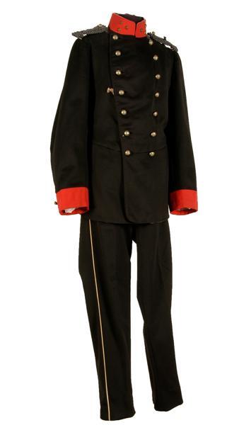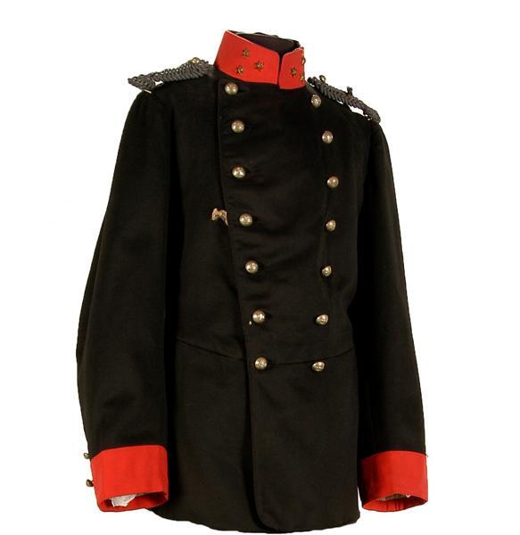 Model na 1869 tot ca 1907, voor kapitein. Uniformjas van zwart laken. Kraag en mouwopslagen van rood laken. Links en rechts op de kraag 3 koperen sterren. Sluiting met 2 rijen van elk 7 gebombeerde metalen knopen met stedekroon en 7 knoopsgaten. Op beide mouwen 2 knopen (model als boven, maar kleiner). Op beide schouders zwart reepje stof. Op linker 1 zwart stofknoopje. Split en kleppen afgezet met wit laken. Aan weerszijden van het split 3 knopen (als op voorpand). Op de schouders zijn schouderpassanten bevestigd (inv.nr. 11747.091). Binnenkant: voering zwarte satinet, rondom armsgaten en op de borst met rood garen gepiqueerd. Langs beleg aan beide zijden een randje witte katoenen satijn met ingeweven blauwe strepen. Steekzakjes op beleg genaaid. 2 rijen van 7 tegenknoopjes op beleg. Op taillehoogte: rode leren band. Op beide voorpanden onder de band een steekzak in de voering. Voering mouwen: katoenen satijn als boven. Boven in beide armsgaten een zwarte lus. Op kraag 2 metalen haken en ogen en 2 metalen, scharnierende dubbele ogen. Mogelijk behorend bij inv.nr. 11747.066.