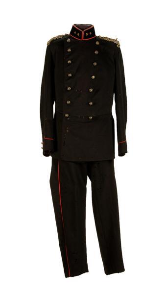 Model 4 april 1868, voor eerste luitenant der artillerie. Uniformjas van zwart laken. Kraag donkerblauw fluweel, afgezet met rood laken. Links en rechts op kraag 2 koperen sterren. Mouwopslagen met punt naar boven, rood gebiesd. Zwart laken afgezet met biesjes van rood laken. Sluiting met 2 rijen van 7 gebombeerde metalen knopen met gekruiste kanonnen en 7 knoopsgaten. Op beide mouwen 2 knopen (model als boven, maar kleiner). Op beide schouders passanten van gevlochten zilverkoord (inv.nr. 11747.094), aan een zijde opgenaaid, aan de andere zijde bevestigd met een knoop, als op mouw. Split afgezet met rood laken. Boven aan split 2 metalen knopen, als op voorpand. Binnenkant: voering zwarte satinet, gedeelte achter- en voorpand gepiqueerd (zwart). Beleg van beide voorpanden zwart, gekarteld, met daaronder een randje van rood laken 7 tegenknoopjes met rood garen gestikt steekzakje. Boven taillenaad wit katoenen visgraatband met goudkleurige effektstrepen. Links en rechts onder taillenaad voeringzak. Voering mouwen: witte katoenen satijn met groene strepen. Op kraag 2 metalen haken en ogen, een slipdasje en een lus van zwart laken. Behorend bij passanten, inv.nr. 11747.094 en pantalon inv.nr. 11747.073.