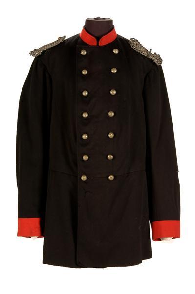 Model 11 maart 1869, voor kapitein. Uniformjas van donkerblauw laken. Kraag en mouwopslagen van rood laken. Kraag sluit met haak en oog. Sluiting jas met 2 rijen van 7 gebombeerde, metalen knopen en 7 knoopsgaten. Achter de bovenste 6 knopen van iedere rij gladde metalen tegenknoopjes. Op elke mouw 2 knoopjes met stedekroon, klein model. Op de schouders passanten van gevlochten zilverkoord, inv.nr. 11747.104. Passanten op beide schouders bevestigd met een metalen beugel, geschoven door een trensje en een sleuf van donkerblauw laken. Op beide schouders een donkerblauw (zwart?) stofknoopje. Op linker schouderpassant een knoop. Split en kleppen op achterpand afgezet met wit laken. Op iedere klep 3 metalen knopen (groot). Op linkervoorpand 2 kleine trensjes. Voering: lijf van donkergroene satinet. Voorpanden en gedeelte achterpand gepiqueerd. Lusje van dezelfde stof op kraag. Slipdasje van witte glanzende keperkatoen, gevoerd met donkergroene satinet, bevestigd met 2 knopen van dezelfde satinet. Op taillehoogte ingenaaid rode leren band. Voorschoot gevoerd met zwarte keperzijde. Zakken aan beide zijden van split van donkerbruine keperkatoen. Mouwen gevoerd met witte katoen, bedrukt met witte diagonalen en blauwe streepjes.