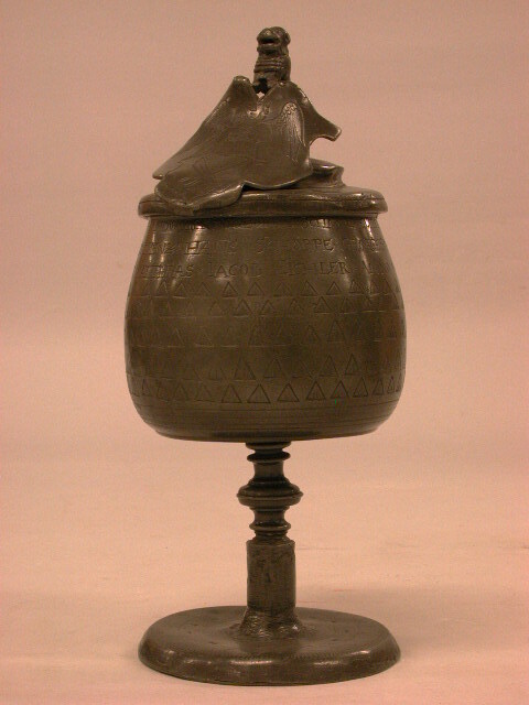 Bokaal, kelkvormig op smalle gedraaide stam die primitief is gesoldeerd op plompe,ronde voet. De cuppa is geheel overdekt met graveerwerk boven enkele gedraaide groeven langs de onderrand. Graveerwerk bestaat uit 5 rijen driehoekjes. Daarboven staat tussen bloemetjes: JOHAN SOCHORIGK,DER ZEIT HANDWERCKSM.GEORGE SCHMÖL ELTISTER MATTHEUS MATTHIAS/CASPAR AUGUSTIN, ABRAHAM SCHIMENZ, HANS SCHOPPE, GEORGE SCHWOD/ CHRISTOPH ARNOLD, HANS MATTHIAS, JACOB EICHLER ANNO 1652". Tegen de cuppa een rechthoekig oogje gesoldeerd, waarschijnlijk voor een schildje bedoeld. Op de deksel zit een leeuwtje dat een groot, uitgezaagd schild vasthoudt met daarin gegraveerd een engel als schildhouder die een wapenschild met een grote geopende schaar vasthoudt, waaronder '1652'.