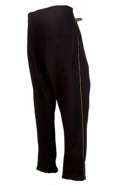 Model 30 april 1856, voor schutter. Pantalon van donkerblauw laken. Zijnaden gebiesd met wit laken. Voor: blinde sluiting met 3 zwarte metalen knoopjes en knoopsgaten. Bovenaan een zwarte metalen haak en oog. Split in tailleband en gedeelte van de achternaad. Taillewijdte te verstellen met 2 bandjes van donkerblauw laken en een metalen gesp op het achterpand. 2 steekzakken in de zijnaden. Voering: grijze katoen.
