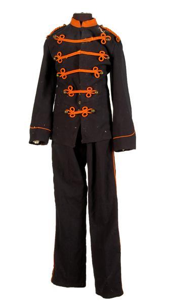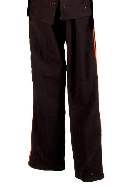 Model in gebruik in 1908, voor schutter in Oost-Indiƫ (Batavia). Pantalon van donkerblauw wollen kamgaren. Middenvoor een blinde sluiting met 4 kleine metalen knoopjes en 4 knoopsgaten. Bovenaan een metalen knoop (groter dan de 4 andere) op het linker- en een knoopsgat op het rechtervoorpand. Links en rechts op voorpand een steekzak. Split in tailleband middenachter en gedeelte van de achternaad. Taillewijdte te verstellen met 2 bandjes van donkerblauw wollen kamgaren en een metalen gesp op het achterpand. Zakken, voering langs tailleband, voering tailleband en losse bandjes: witte katoen. Op zijnaden oranje wollen soutache band. Behorend bij attilla, inv.nr. 11747.056.